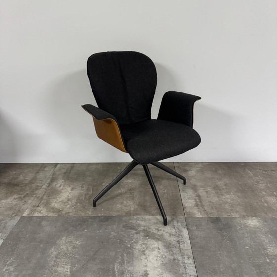 Drehbar, keine automatische Rückstellung. Material: Future Mittelgrau. Leder: Rancho Cognac. Gestell: BP100 Anthrazit. Maße: B 69 cm x H 48 cm x T 43 cm x H 91 cm. Leder, Stoff.