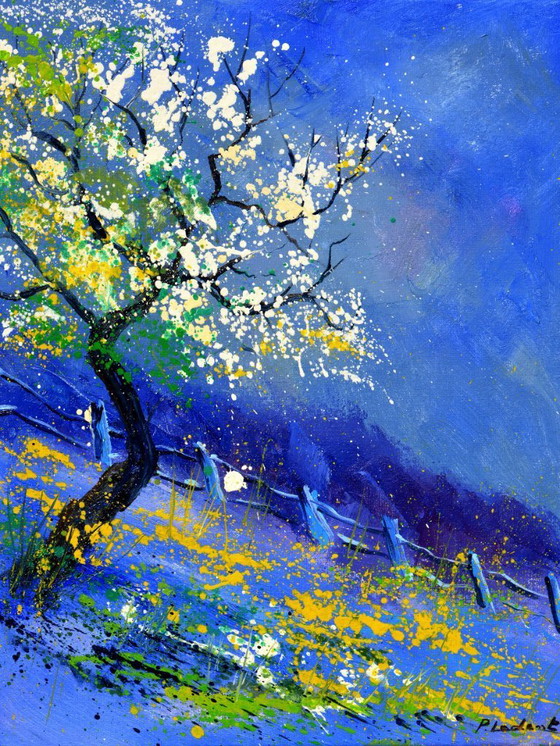 Dieses Kunstwerk zeigt eine lebendige und dynamische Landschaft mit einem Baum in voller Blüte als zentrales Element. Die Farbwahl ist kühn und fesselnd, wobei vor allem tiefe Blautöne für den Himmel und den Boden verwendet werden, die der Szene eine heitere und verträumte Atmosphäre verleihen. Der Baum mit seinen leuchtend weißen Blüten scheint vor Energie aus der Leinwand zu platzen. Gelbe und grüne Farbtupfer um seine Wurzeln herum verleihen ihm eine bemerkenswerte Lebendigkeit und symbolisieren die Erneuerung und Vitalität der Natur. Dieses Gemälde zeichnet sich durch seine ausdrucksstarke Technik aus. Die Pinselstriche sind sichtbar und gerippt, um die Intensität des Windes zu verdeutlichen, was sich in der Neigung des Baumes und der dynamischen Krümmung des angrenzenden Zauns widerspiegelt. Der Zaun mit seinen weißen Linien, die sich von dem bläulichen Hintergrund abheben, lenkt den Blick des Betrachters auf subtile Weise durch die Komposition und schafft ein Gefühl von Perspektive und Tiefe. Die Gegenüberstellung der unruhigen Bewegung des Baumes mit der Ruhe des Himmels erzeugt eine harmonische Spannung, die typisch für die Landschaften des Impressionismus ist und zu tiefer Kontemplation einlädt. Dieses Werk verkörpert sowohl die zarte Schönheit als auch die unwiderstehliche Energie der Natur und lädt den Betrachter ein, sich in diesem zeitlosen Moment zu verlieren.