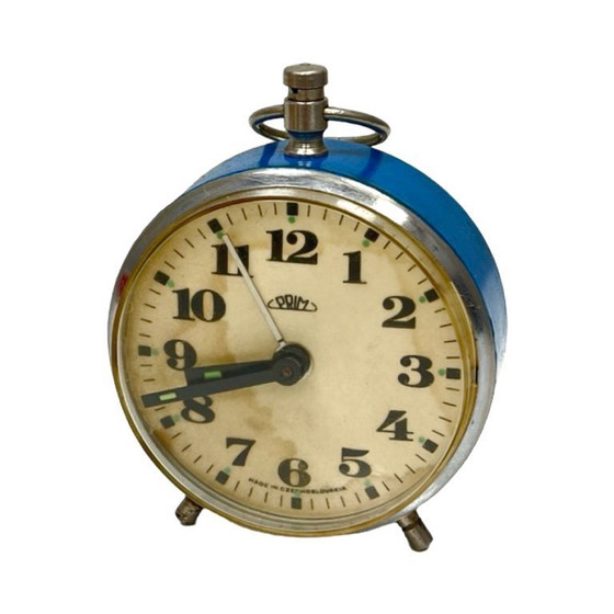 Ein klassischer, mechanischer Wecker von PRIM in einem seltenen blauen Gehäuse. Dieses Modell zeichnet sich durch einen markanten Tragegriff und ein klassisches Design aus, typisch für die tschechoslowakische Produktion der 1960er und 1970er Jahre.