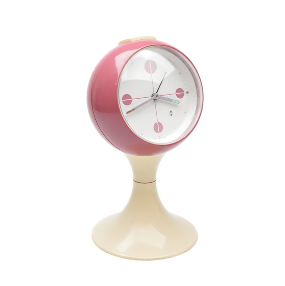 Ein 1960er Jahre Weltraumzeitalter kugelförmigen Wecker mit einem fabelhaften dusky rosa und cremefarbenen Körper, hergestellt von bekannten deutschen Uhrenhersteller Blessing. Diese retro-futuristische Tisch- oder Nachttischuhr hat ein Sockeldesign, ein gewölbtes Fenster, das ein weißes Zifferblatt mit fetten rosa runden Ziffern überlagert, und einen cremefarbenen Weckerknopf auf der Oberseite des abgerundeten oberen Körpers. Dieses besondere Modell in dieser Farbkomposition (ein helles gräuliches Violett - und Beige) ist etwas selten und sammelwürdig. Es handelt sich um eine mechanische und voll funktionsfähige Aufzugsuhr; der Wecker funktioniert und die Uhr läuft perfekt auf die Minute für ein paar Tage. Der Sockel kann abgeschraubt werden, um nur die kugelförmige Uhr zu zeigen. Höhe: 21,5 cm Breite: 12 cm