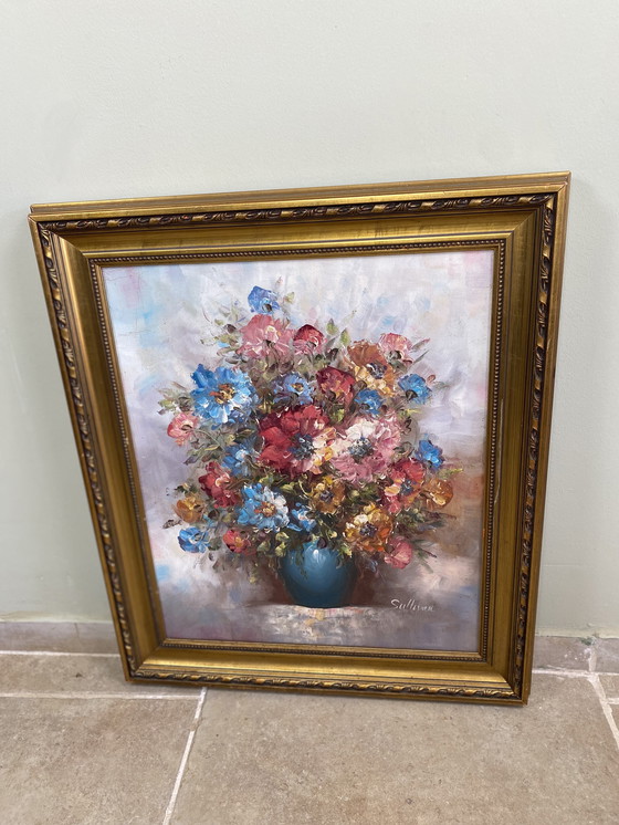 Teilweise mit einem Spachtel bemalt, um diesem prächtigen Blumenstrauß Struktur zu verleihen. Der wunderschön gerahmte, geschnitzte und vergoldete Holzrahmen weist normale Gebrauchsspuren auf.