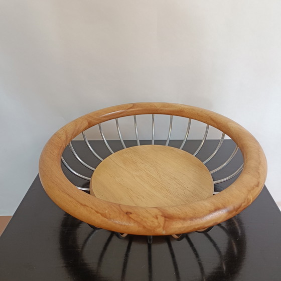 Schlichte Vintage-Obstschale von Ulf Hanses für Boda Nova. Die Schale hat einen Holzsockel mit Metallstäben, der mit einem Holzring abgeschlossen ist.