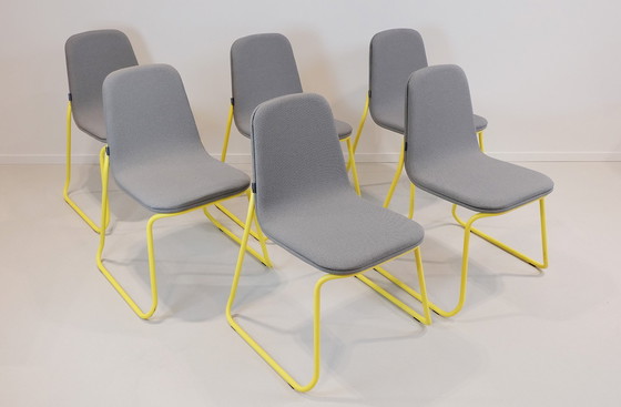 Der Freischwinger Siren S01, stapelbar. Diese Version in einem gelben Rahmen, ist der Sitz auf der Vorder- und Rückseite in der Gabriel Cura Stoff gepolstert. Es sind 6 Stück verfügbar, einige Modelle haben leichte Schäden an der Unterseite des Rahmens, die auf den Fotos zu sehen sind. Zustand: neu mit leichten Beschädigungen. Zu sehen und zu testen in unserem Ausstellungsraum in Best, die Niederlande.