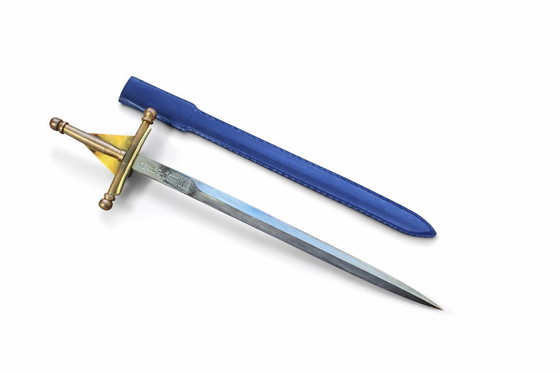 Brieföffner in Schwertform, hergestellt in Toledo, Spanien, in den 1950er Jahren. Mit Etui, Maße 16 cm. Graviert mit „Toledo - Spain“ und „Balbonini Savona Cast Iron Radiators“.