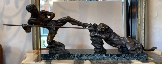 Wunderschöne und ausdrucksstarke Bronzeskulptur, signiert P. Berjean (französischer Bildhauer, 20. Jahrhundert). Dieses ausdrucksstarke Kunstwerk zeigt einen Mann im Kampf mit einem Panther und strahlt Kraft, Dynamik und Spannung aus – typisch für die Art-déco-Zeit.