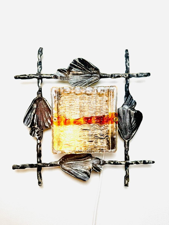 Diese äußerst seltene brutalistische Wandleuchte, entworfen von Tom Ahlström und Hans Ehrlich für A+E Leuchte, verkörpert die raue, skulpturale Ästhetik des schwedischen Designs der 1960er Jahre. Handgefertigt mit einem patinierten Schmiedeeisenrahmen und mundgeblasenem Muranoglas erzeugt sie ein dramatisches Spiel aus Licht und Textur. Die brutalistische Form strahlt Stärke und Kunstfertigkeit aus und macht dieses Stück nicht nur zu einer funktionalen Leuchte, sondern auch zu einem eindrucksvollen Kunstwerk.