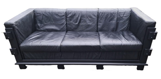 Möchten Sie in Ihrem Wohnzimmer ein markantes Statement setzen? Dann entdecken Sie dieses brutalistische Dreisitzer-Sofa! Mit seinem markanten schwarzen Leder und dem robusten Holzrahmen wird dieses Stück garantiert beeindrucken.