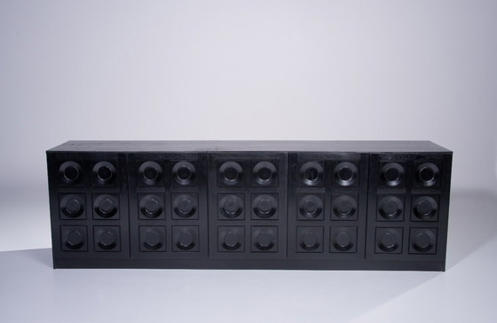 Dies ist ein einzigartiges schwarzes brutalistisches Sideboard aus den 1970er Jahren. Sein kühnes Design zeichnet sich durch eine verschlungene grafische Front mit Kreisen aus.