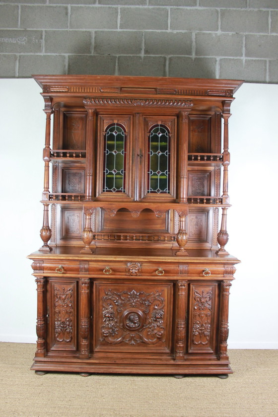 Buffet mit zwei Korpussen in sehr gutem Zustand. Aus Nussbaumholz Henri II. Ende des 19. Jahrhunderts. Schnitzereien mit Arabesken und Maskarons. 2 obere Türen mit Buntglasfenstern. Ziehgriff aus Messing.