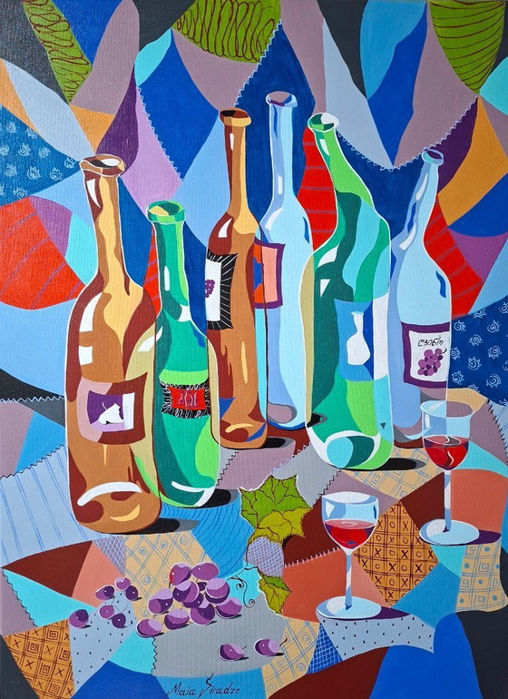 Tauchen Sie mit diesem exquisiten Gemälde von Maia Siradze in die lebendige Welt des Kubismus ein. Das Kunstwerk mit dem Titel „Kleurrijke flessen“ fängt die Essenz des Kubismus durch seine dynamische Komposition und den kräftigen Farbeinsatz ein.