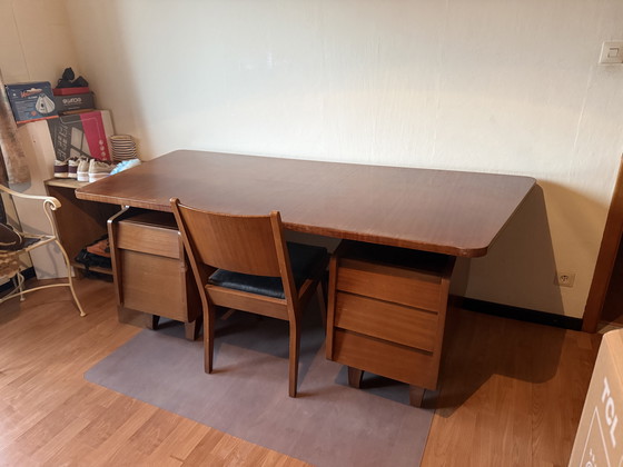 Dieser Schreibtisch ist perfekt für alle, die die Verbindung von Form und Funktion schätzen und somit eine besondere Bereicherung für jedes Zuhause oder Büro darstellt. Fragen Sie noch heute an, um dieses Schmuckstück in Ihre Sammlung aufzunehmen. Für sein Alter in sehr gutem Zustand. (1954!) Zwei Stühle und ein Dactylo-Schreibtisch sind im Lieferumfang enthalten.