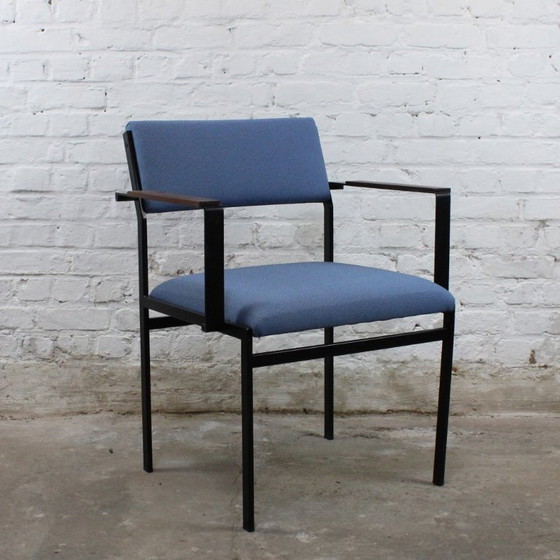 Cees Braakmans Sessel „SM17“ für Pastoe. Hergestellt zwischen 1958 und 1965. Schwarz lackiertes Stahlgestell, Armlehnen aus Massivholz, gepolsterter Sitz und Rückenlehne.