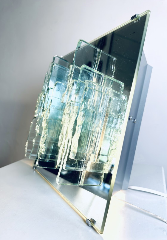 Die 1968 vom renommierten niederländischen Glaskünstler Willem van Oyen entworfene und von Raak Amsterdam produzierte Wandleuchte Breukrelief ist eine kraftvolle Verschmelzung von Skulptur und Licht. Dieses seltene und künstlerische Stück hat eine quadratische Spiegelfront mit vorstehenden Scherben aus grün getöntem Glas, die so angeordnet sind, dass sie das Licht in einer auffälligen, abstrakten Komposition einfangen und streuen. Wenn die Leuchte beleuchtet ist, wirft sie ein dramatisches Licht nach oben und unten, während die verspiegelte Oberfläche subtiles Umgebungslicht und Bewegungen reflektiert.