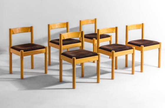 Sechs Esszimmerstühle des Modells „Carimate“, entworfen von Vico Magistretti für Cassina in den 1960er-Jahren. Ursprünglich für den Carimate Golf Club am Comer See in Italien gefertigt, sind diese Stühle mittlerweile weit darüber hinaus verbreitet. Die hier angebotenen Exemplare zeichnen sich durch ein helles Buchenholzgestell und mit einem weichen, braunen, samtartigen Stoff bezogene Sitze aus. Typisch für dieses Modell sind die abgerundeten Beine und die geschwungene Rückenlehne.