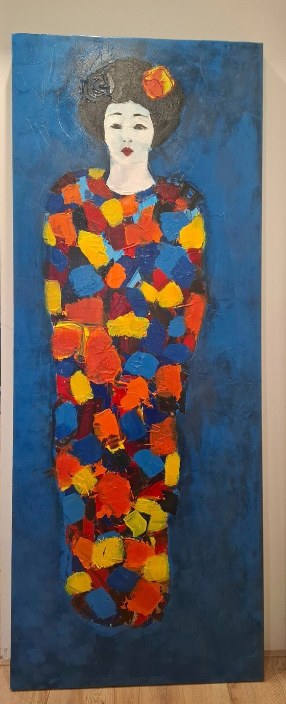 Das abgebildete Gemälde „Geisha“ stammt von der niederländischen Künstlerin Carolina Paulussen (geb. 1963). Ihre Werke, darunter die beliebte Serie „Geisha“, zeichnen sich durch einen lebendigen und zugleich raffinierten Farbauftrag aus, der häufig mit dem Spachtel zur Erzeugung von Struktur aufgetragen wird. Das Original ist in der Regel ein Acrylgemälde auf Leinwand, es existieren aber auch Siebdrucke in verschiedenen Ausführungen. Abholung bevorzugt