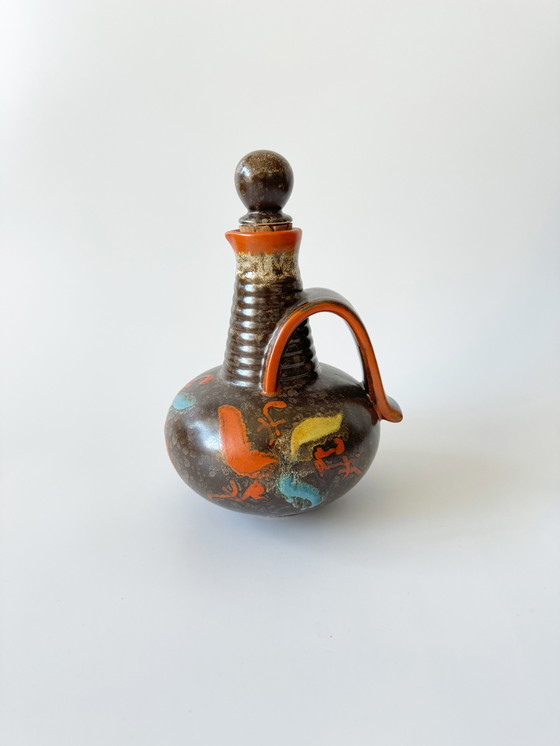 Besonders hervorzuheben sind die bunten, abstrakten Illustrationen in leuchtendem Orange, Gelb und Blau, die den Krug zu einem einzigartigen Sammlerstück machen. Ein wunderschönes Beispiel für Studio-Töpferei und Handarbeit aus Deutschland.