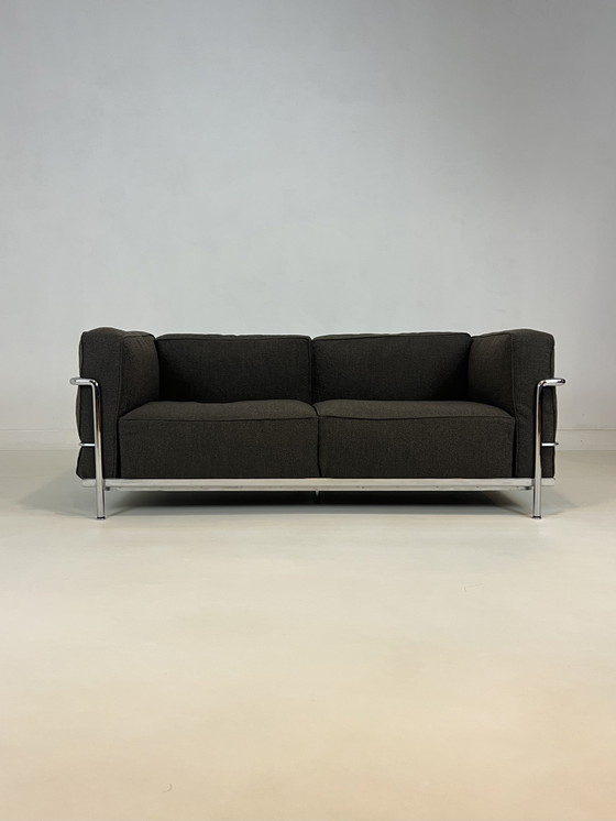 Das ikonische LC3 „Grand Confort“-Zweisitzer-Sofa, entworfen von Le Corbusier, Pierre Jeanneret und Charlotte Perriand für Cassina. Dieses Vintage-Stück ist mit einem wunderschönen braungrauen Stoff bezogen und verfügt über den originalen, gestempelten Stahlrahmen (siehe Fotos). Ein zeitloses und elegantes Design, das Komfort und Struktur vereint.