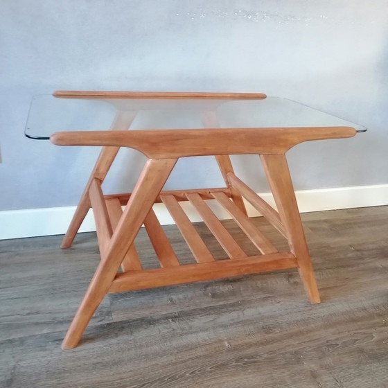 Italienische Schönheit! Dieser schöne Couchtisch aus Holz stammt aus den 1950er/60er Jahren. Ein Entwurf von Cesare Lacca für Cassina. Produziert in Italien. Schönes Design durch die leichte Biegung in der Holzarbeit. Der Tisch ist mit einer Glasplatte ausgestattet und darunter befinden sich zusätzliche Regale, um Ihre Lieblingszeitschriften aufzubewahren. Auf jeden Fall ein elegantes Exemplar. In Anbetracht seines Alters in gutem Zustand. Die Glasplatte ist makellos und hat nur minimale Benutzerkratzer. Ein Fest für die Augen! Wird er bald in Ihrer Einrichtung zu sehen sein? Maße H48 x B121 x T50 cm Cassina ist ein italienischer Möbelhersteller, der für seine hochwertigen Designermöbel bekannt ist. Das Unternehmen wurde 1927 in Meda, Italien, gegründet und hat sich seitdem einen Ruf als einer der führenden Hersteller von zeitgenössischem Design erworben. Cesare Lacca (1913-1978) war ein italienischer Möbeldesigner und Innenarchitekt, der Mitte des 20. Jahrhunderts berühmt wurde. Jahrhunderts berühmt wurde. Seine innovativen Entwürfe kombinierten traditionelle italienische Handwerkskunst mit modernistischen Formen und Materialien und konzentrierten sich auf stromlinienförmige und funktionale Designs, die in der Gesellschaft der Nachkriegszeit auf der Suche nach Innovation und Fortschritt Anklang fanden. Trotz seines Erfolges blieb Lacca den Grundsätzen von Handwerkskunst und Qualität verpflichtet und schuf bis zu seinem Tod schöne und langlebige Stücke. Heute werden seine Entwürfe für ihre zeitlose Eleganz und dauerhafte Attraktivität gelobt.