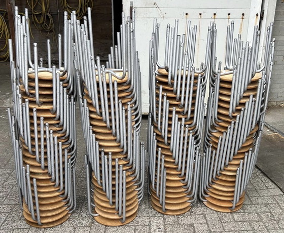 Seit jeher beliebt in Restaurants, Cafeterias und im Projektdesign. Wunderschönes Set mit 92 Hockern mit Metallbeinen und Sperrholzsitzen.