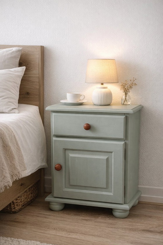 charmanter hellgrüner Nachttisch – im Brocante-Stil