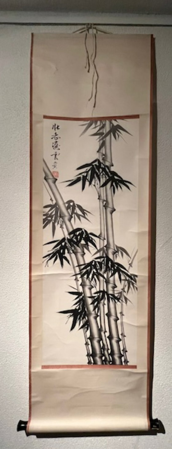 Ein wunderschön und ausdrucksstark gemaltes Bambusbild. Entstanden 1984 in Chengdu. Material: Aquarell auf Reispapier. Die Symbolik von „flexibel wie Bambus“ ist in vielen asiatischen Kulturen zentral und steht für Widerstandsfähigkeit, Anpassungsfähigkeit und innere Stärke. Anders als eine starre Eiche, die bei einem schweren Sturm brechen kann, biegt sich Bambus im Wind und springt dann in seine ursprüngliche Position zurück. Bambus symbolisiert die Fähigkeit, den Widrigkeiten und Stürmen des Lebens standzuhalten, ohne zu zerbrechen. Verleihen Sie Ihrem Interieur mit diesem wunderschönen chinesischen Rollbild einen Hauch asiatischer Eleganz. Das in Schwarz-Weiß gehaltene Bambusbild strahlt zeitlose Eleganz aus und schafft eine ruhige und beruhigende Atmosphäre. Authentisches chinesisches Design mit detaillierten Pinselstrichen, die die feine Textur des Bambus perfekt einfangen. Maße: 158 x 48 cm, Maße des gerahmten Reispapiers: 98 x 38 cm. Zustand: Das Reispapier ist in gutem Zustand und eignet sich zum Einrahmen. Es befindet sich ein Riss in der oberen linken Ecke (siehe die letzten beiden Fotos). Preisvorstellung: 60 €; Startgebot: 50 €. Kein Versand. Nur Abholung in Utrecht.