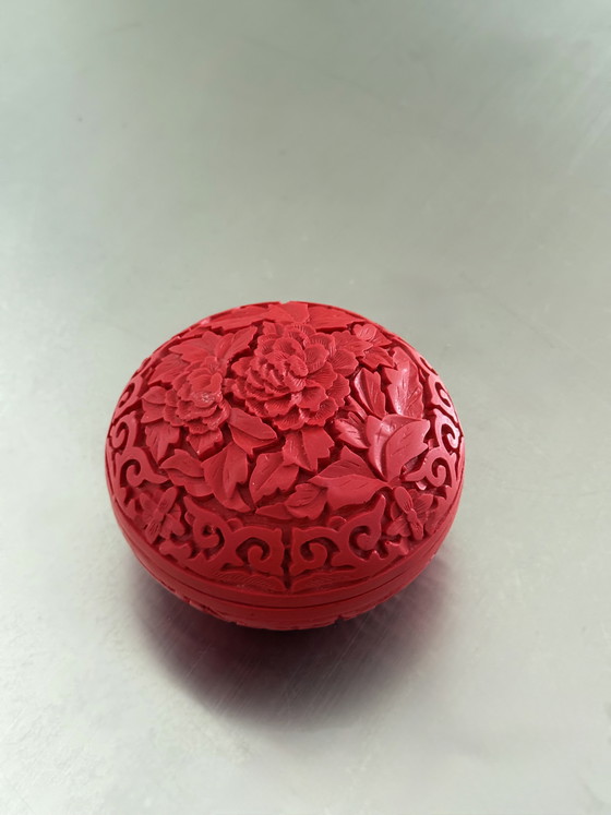 Innen und Boden sind schwarz lackiert und bilden einen wunderschönen Kontrast zum tiefen Rot des Zinnoberholzes. Ein sorgfältig gefertigtes und dekoratives Objekt, das handwerkliches Können und kunsthandwerkliche Finesse ausstrahlt.