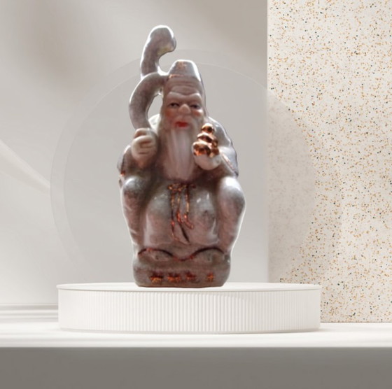 Verleihen Sie Ihrem Zuhause mit dieser handbemalten Vintage-Figur des Shouxing (Shou Lao) eine Atmosphäre von Frieden und Wohlstand. Erkennbar an seiner charakteristischen hohen Stirn und seinem heiteren Lächeln, ist er der legendäre chinesische Gott der Langlebigkeit und einer der drei Glücksgötter.