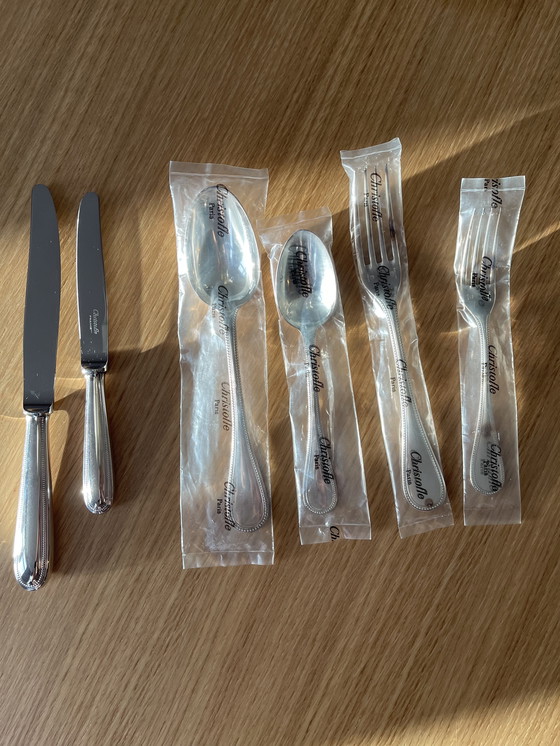 Dieses 6-teilige Silberbesteck-Set von Christofle, Modell „Perles“, besteht aus vier unbenutzten Teilen in Originalverpackung. Die beiden Messer sind zwar neuwertig, aber nicht mehr originalverpackt. Das Set umfasst zwei Löffel, zwei Messer und zwei Gabeln. Der Neuwert beträgt mindestens 655 Euro.