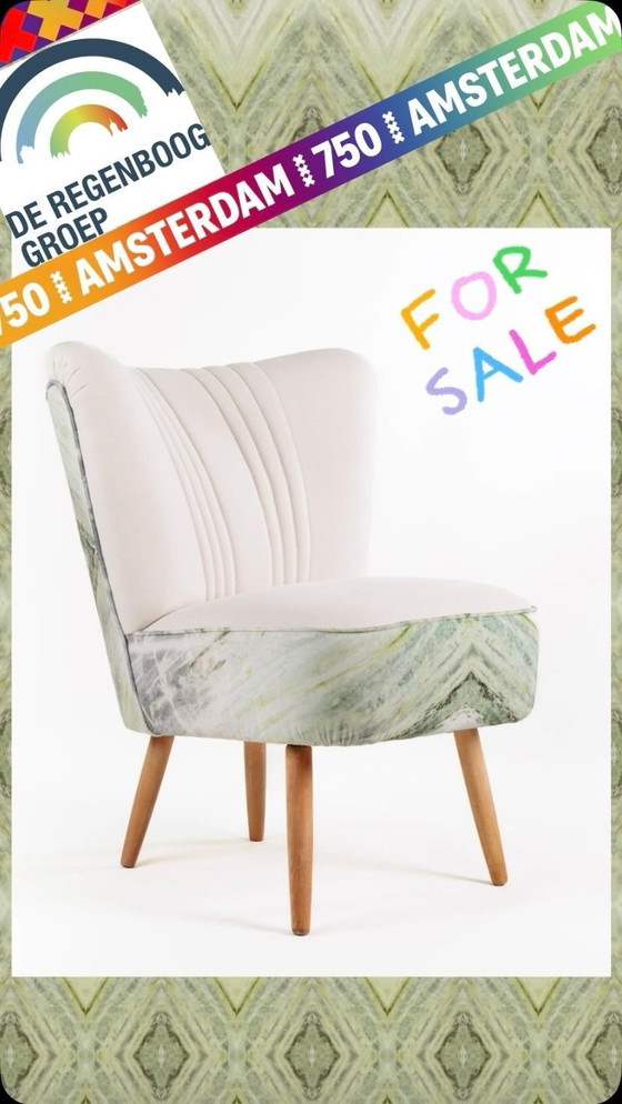 Dieser Cocktailsessel aus den 1950er Jahren wurde komplett zerlegt, geprüft und mit dem noch guten Stahlfedersitz und Teilen aus neuem Schaumstoff sorgfältig wieder aufgebaut. Dieser Stuhl ist ein gemeinsames Projekt zwischen House of ien und Yolanda Paul (Design und Design aus Naturstein).