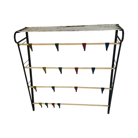 Die im Laufe der Zeit entstandene Patina unterstreicht den Vintage-Charme und trägt zum besonderen Charakter bei. Wie auf den Fotos zu sehen, sind Roststellen und Lackabplatzungen vorhanden. Die Garderobe ist jedoch äußerst stabil, alle Gebrauchsspuren sind oberflächlich. Sie ist ein echtes Vintage-Stück.