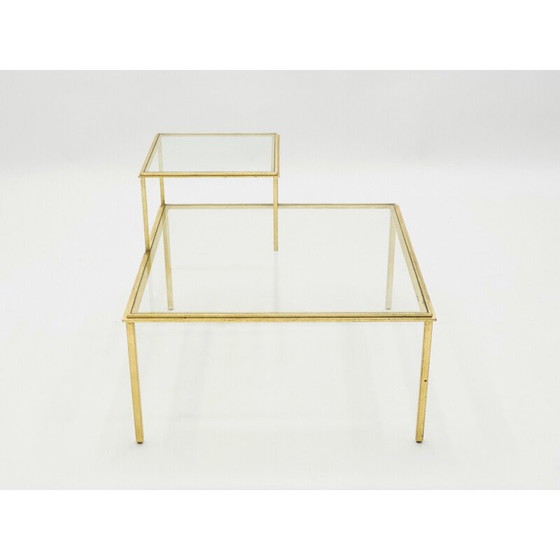 Niedriger Tisch von Robert und Roger Thibier aus mit Blattgold vergoldetem Schmiedeeisen aus den 1960er Jahren. Ein kleines Regal ist an die Struktur geschweißt, um einen Boden hinzuzufügen. Der Sockel ist aus Schmiedeeisen und dürfte etwa 20 kg wiegen.