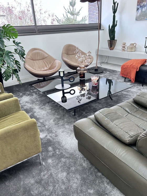 Wunderschöner, zeitloser Couchtisch von Beek, Modell Maupertuus. Tischplatte: 10 mm starkes, gehärtetes, grau getöntes Glas.