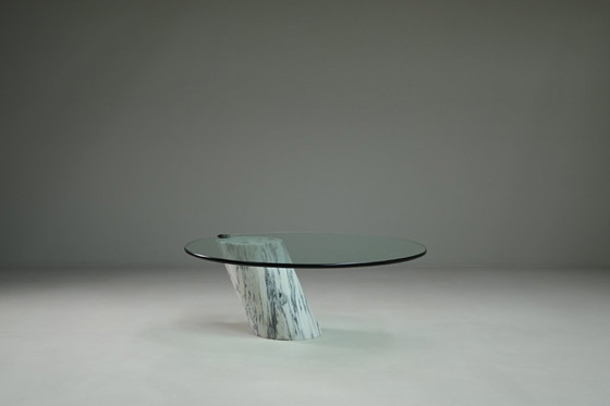 Couchtisch K1000 von Team Form AG für Ronald Schmitt, Deutschland, 1970er Jahre. Der Tisch kombiniert einen skulpturalen Sockel aus massivem, weißem Marmor mit dezenter grauer Maserung mit einer dicken, runden Glasplatte in Kragarmkonstruktion. Dieses asymmetrische Design verleiht dem Möbelstück eine leichte, fast schwebende Anmutung bei gleichzeitig starker architektonischer Präsenz. Der Marmorsockel sorgt für einen stabilen Stand, während die Glasplatte den Raum offen und aufgeräumt wirken lässt. Die Kragarmkonstruktion sorgt für Balance, ohne den Tisch schwer wirken zu lassen, sodass er als zentrales Element fungieren kann, ohne den Raum zu dominieren. Team Form AG war ein Schweizer Designkollektiv, das Mitte bis Ende des 20. Jahrhunderts aktiv war und für seinen minimalistischen Ansatz und innovative Konstruktionslösungen bekannt war. Ronald Schmitt, ein deutscher Hersteller, erlangte Bekanntheit für die Produktion hochwertiger Möbel, die handwerkliches Können mit zukunftsweisendem Design durch die Zusammenarbeit mit namhaften Designern verbanden. Ein wohlproportioniertes Möbelstück, das den zurückhaltenden Charakter des europäischen Designs der 1970er Jahre widerspiegelt. Die Glasplatte weist einige Gebrauchsspuren auf, befindet sich aber insgesamt in einem sehr guten Vintage-Zustand.