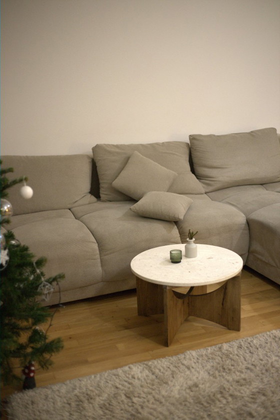 Couchtisch rotunda Crema Perla aus Naturstein und Massivholz Eiche