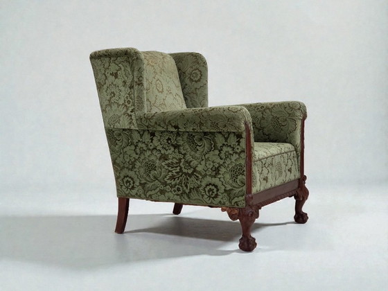 Dänischer Relaxsessel aus den 1950er Jahren, grüner Möbelveloursbezug, geschnitztes Eichenholz.