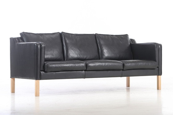 Dreisitziges schwarzes Ledersofa von Mogens Hansen auf lackierten Birkenbeinen, lose Kissen. Skandinavischer Designklassiker im Stil von Borge Mogensen Zustand Gut, altersbedingte Gebrauchsspuren und Patina Maße Breite: 198 cm Tiefe: 82 cm Höhe: 80 cm Sitzhöhe: 42 cm