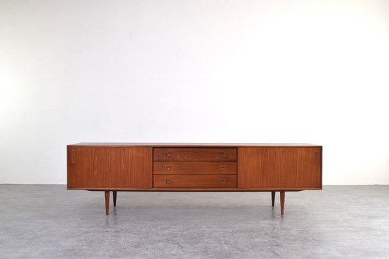 Ein langes Teak-Sideboard im skandinavischen Modernismus vereint Funktionalität mit einer ausgewogenen, zeitlosen Ästhetik. Seine großzügigen Proportionen – 240 cm Länge – verleihen ihm eine starke visuelle Präsenz, ohne dabei an Leichtigkeit und horizontaler Linienführung einzubüßen.