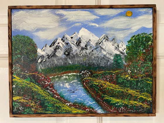 Hier wollte ich das Gefühl der friedlichen Einsamkeit vermitteln, das man im Herzen der Berge findet. Die helle Sonne wirft ein warmes Licht auf die schneebedeckten Gipfel und das lebendige Grün der umliegenden Natur, und ein sanfter Fluss verleiht der Szene ein Gefühl der ruhigen Bewegung.