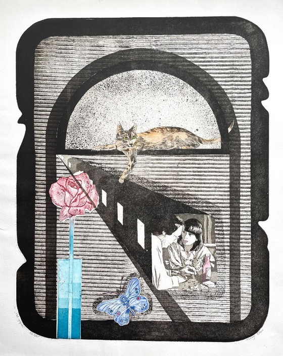 Künstlerin: Margo Ellen. Werke im In- und Ausland von Privatpersonen, Unternehmen und Institutionen erworben. Gewinnerin des Publikumspreises für Grafik in Nordholland. Mehrfarbige Radierung, signiert und gerahmt. Maße: 60 x 70/80 cm.