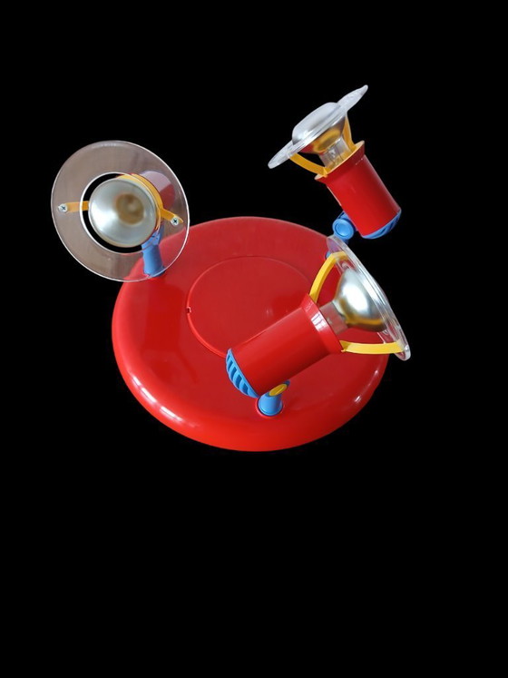 Ikonische postmoderne Deckenleuchte aus den 1980er-Jahren, entworfen und hergestellt von der belgischen Marke Massive. Die drei Strahler lassen sich sowohl vertikal als auch horizontal in jede gewünschte Richtung drehen.
