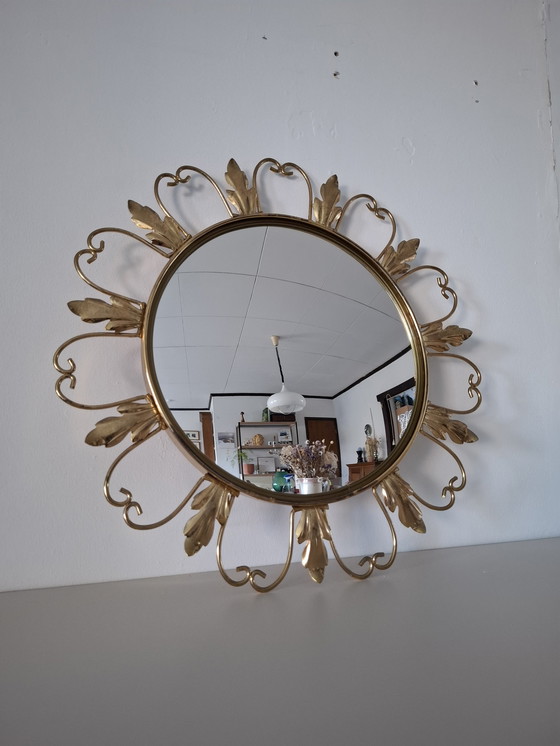 Schöner Vintage-Spiegel mit Fischauge und Sonnenschliff von Deknudt. Zeitraum: 1960er Jahre. Herkunft: Belgien. Der Spiegel ist konvex/konvex. Durchmesser: 46cm. Durchmesser des Spiegels: 29 cm. Tiefe: 3 cm. Vintage / Retro / Sonnenspiegel / Hexenspiegel / 60er Jahre / Hollywood Regency