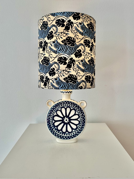 Der Lampenschirm wurde aus einem hochwertigen Baumwollstoff aus Japan mit markantem Tiger- und Pflanzenmotiv gefertigt. Das grafische Muster bildet einen spannenden Kontrast zur klassischen Keramik und sorgt im eingeschalteten Zustand für ein warmes, atmosphärisches Lichtbild.