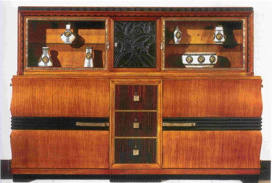 Art-déco-Schrank De Coene, Modell Brillat-Savarin. Der Schrank ist restaurierungsbedürftig; am Gesims fehlen einige Teile, und der Lack muss erneuert werden. Er besteht aus zwei Teilen und kann daher auch ohne den Aufsatz ausgestellt werden. Wunderschöne Schubladen aus Makassar-Holz. Der Aufsatz ist mit geschnitztem Ebenholz verziert. Das erste Foto ist ein Katalogfoto; die anderen Fotos zeigen den Schrank selbst.