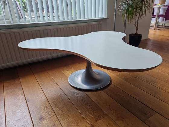 Dieser moderne Couchtisch hat ein einzigartiges Design mit drei Oberflächen und einem runden Bein aus Edelstahl. Die Tischplatte ist weiß mit einem braunen Rand und bietet einen stilvollen Kontrast. Perfekt für ein modernes Wohnzimmer, bietet der Tisch sowohl Funktionalität als auch Ästhetik. Der Fuß aus rostfreiem Stahl verleiht ihm ein modernes Aussehen.