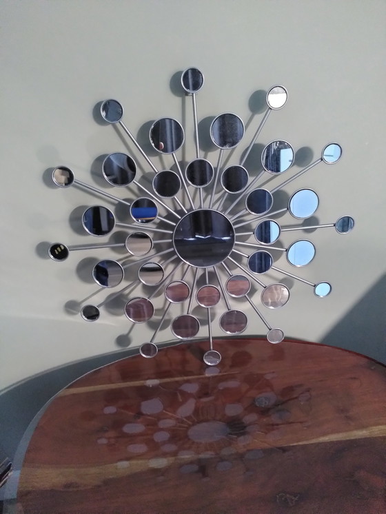 Dieser Spiegel ist aus Stahl und Glas gefertigt. Die runden Spiegel haben jeweils ihre eigene Einstellung, und die gesamte Zusammensetzung ist auch wieder rund. Er ist in ausgezeichnetem Zustand. Der Spiegel wurde in den 1970er Jahren in Italien hergestellt und von dort gekauft.