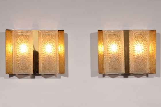 Das wunderschön strukturierte Glas streut das Licht auf bezaubernde Weise und schafft ein warmes und einladendes Ambiente. Perfekt für Flure, Schlafzimmer oder Wohnräume, kombinieren diese Vintage-Stücke Funktionalität mit künstlerischer Eleganz. Dies ist ein Satz von 2 Lampen.
