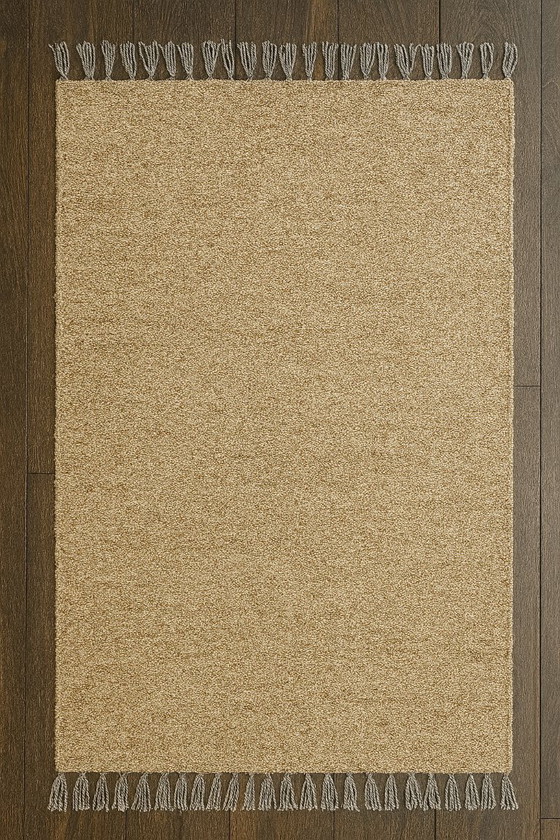 Designer-Teppich 160x230 - Handgefertigt in Ägypten - Ägyptische Wolle - Beige mit grauen Fransen