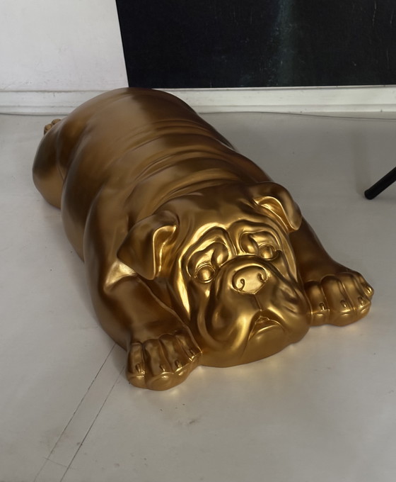 Designerskulptur einer liegenden englischen Bulldogge aus Goldharz, 90 cm