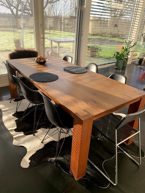 Der Tisch wurde ursprünglich bei Kok Woodcenter Hoogland (inzwischen geschlossen) gekauft. Er weist Gebrauchsspuren auf und wurde regelmäßig mit Möbelöl behandelt. Kontaktieren Sie uns für weitere Informationen oder um einen Besichtigungstermin zu vereinbaren.