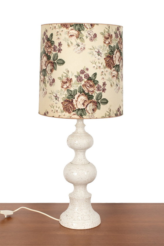 Deutsche Keramik-Tischlampe mit Vintage-Schirm mit Rosendekor. Der Sockel hat eine grobe Textur und ist glasiert, in gutem Vintage-Zustand.